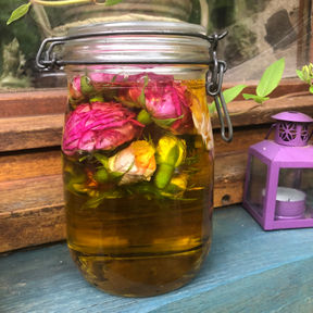 Elles sont ensuite déposées dans de l'huile de sésame bio de qualité pour 3 semaines de macération solarisée, c'est à dire exposées au Soleil pour recevoir ces rayons lumineux, devenant ainsi une huile médicinale.